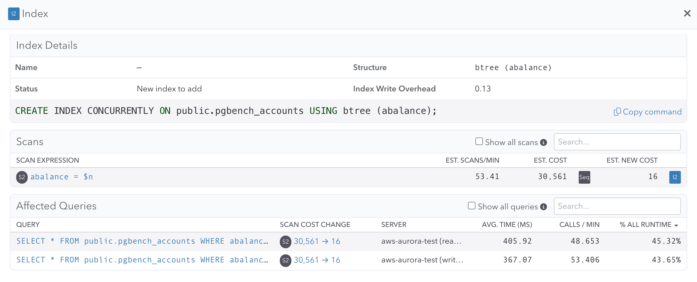 (2 rows)When pganalyze captures query activity on a database, it detects these two scans, tracks their frequency, and determines if the index is worth adding or not. A sequential scan falls back to scanning all 10,000 rows to find one match, so Index Advisor recommends creating an index for missing.
