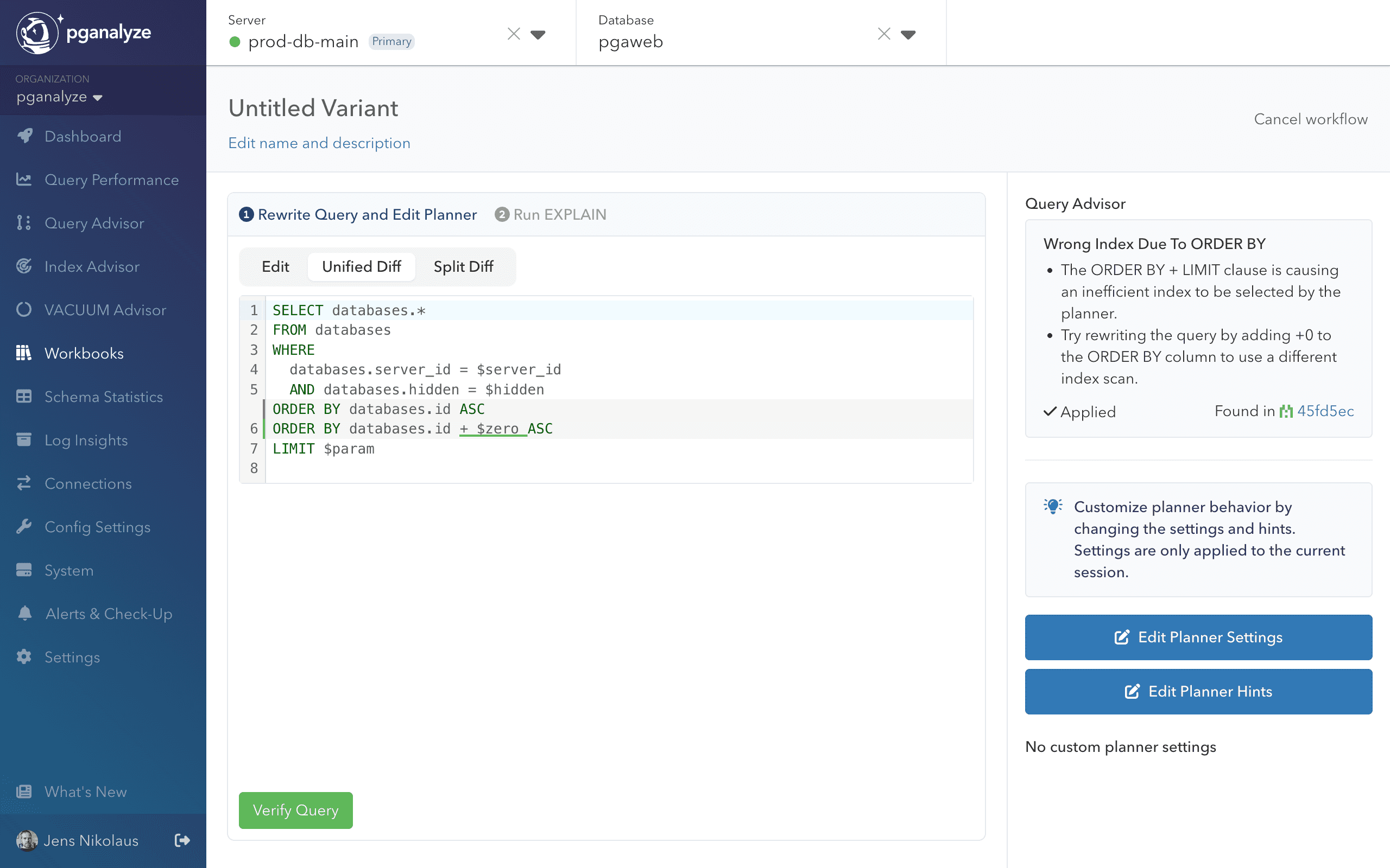 At pganalyze we create purpose-built systems that address common Postgres challenges in production. Today, we’re excited to introduce pganalyze Query Advisor. It continuously analyzes EXPLAIN plans, detects problematic patterns, and provides clear query rewrites you can test and apply with confidence.