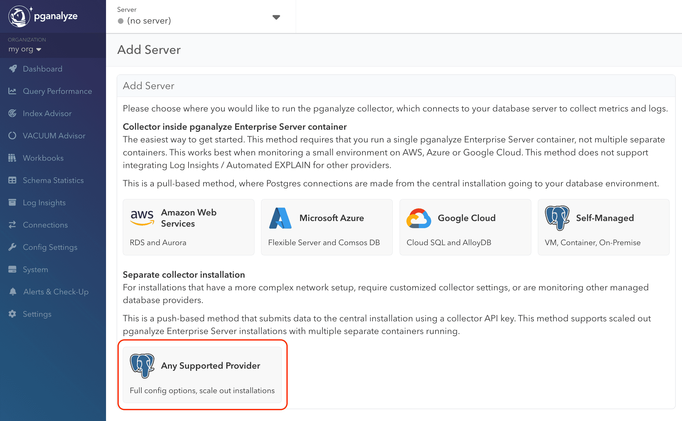 The pganalyze Collector is not included in the Enterprise Server Slim image, so you will need to run it separately. After selecting the "Add Server" button at the bottom of the server selection dropdown, select the "Any Supported Provider" button to get started. Choosing any option under the "Collector inside pganalyze Enterprise Server container" will not work.